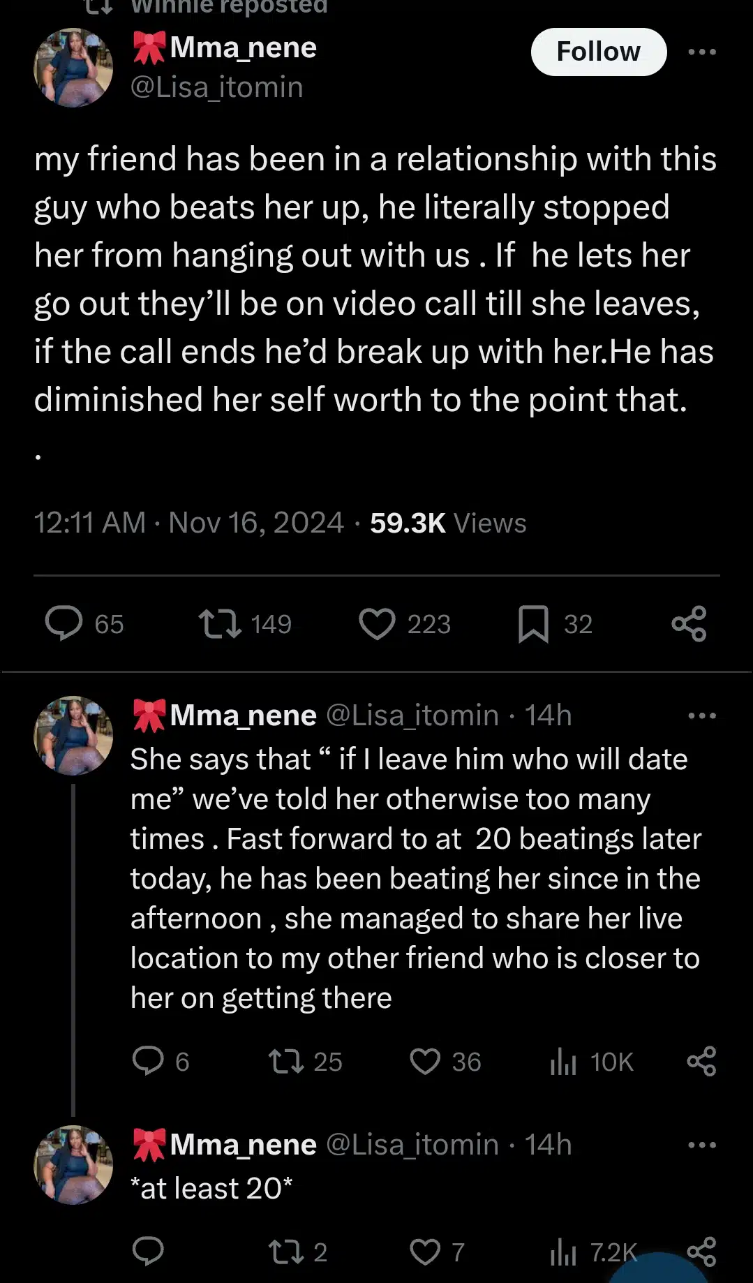 “She says that “if I leave him who will date me” we’ve told her otherwise too many times . Fast forward to at least 20 beatings later today, he has been beating her since in the afternoon , she managed to share her live location to my other friend who is closer to her on getting there.”