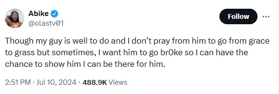 ‘Though my guy is well to do and I don’t pray from him to go from grace to grass but sometimes, I want him to go br0ke so I can have the chance to show him I can be there for him.”