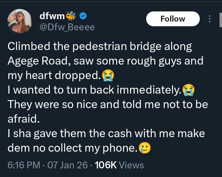 She wrote, “Climbed the pedestrian bridge along Agege Road, saw some rough guys and my heart dropped.😭