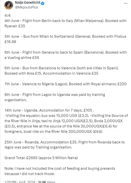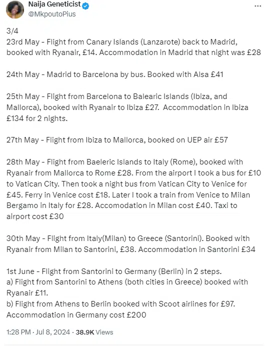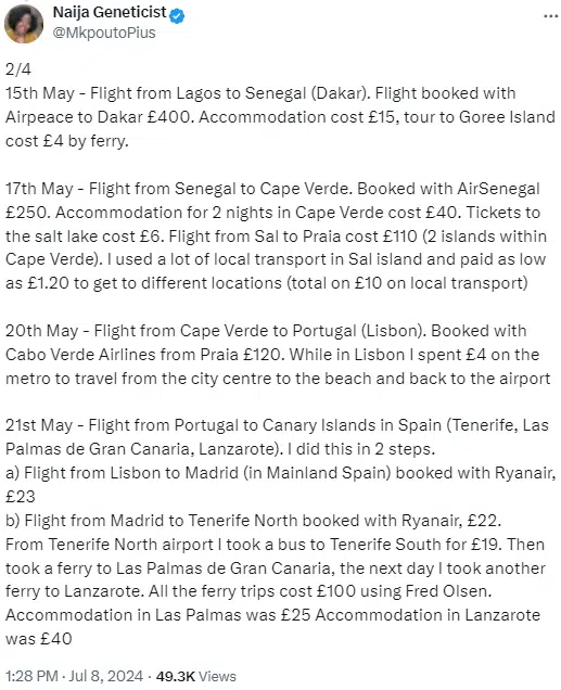 According to the lady, the entire trip cost her approximately £3,000 (N6 million). She visited Senegal, Cape Verde, Portugal, Spain, Italy, Vatican City, Greece, Germany, Switzerland, and Uganda during her trip.