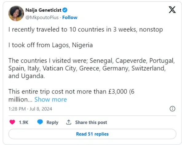 A Nigerian lady, identified as @MkpoutoPius on Twitter, has captured the attention of many with her solo trip to 10 countries in just three weeks using a Nigerian passport.