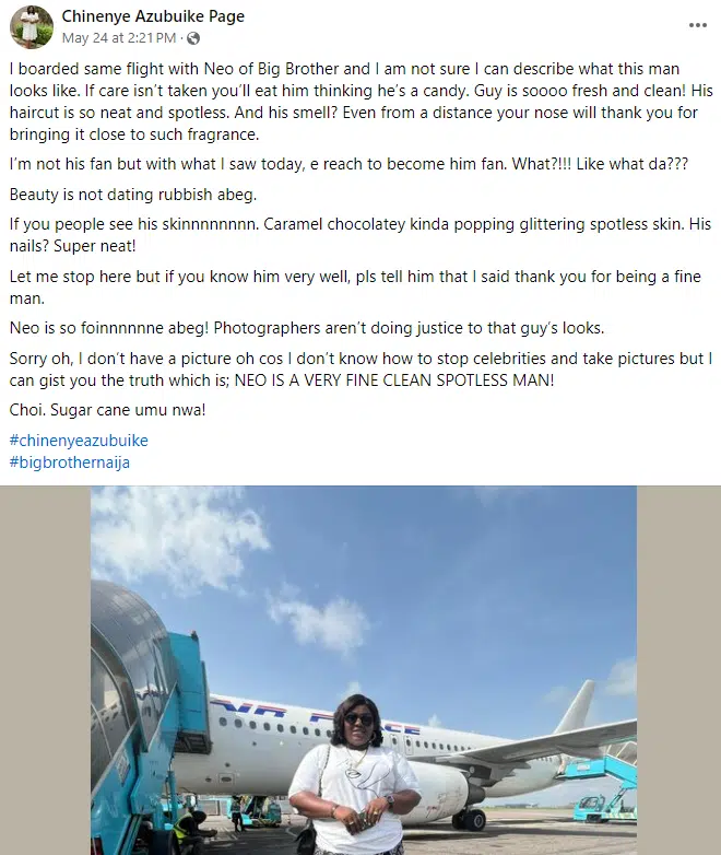 A Nigerian lady, Chinenye Azubuike, has shared her admiration for BBNaija star Neo Akpofure after spotting him on an Air Peace flight.