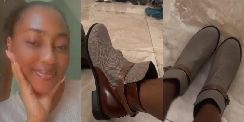 A Nigerian lady left social media users in stitches after sharing a hilarious video of the shoes she received from her uncle in the United States.