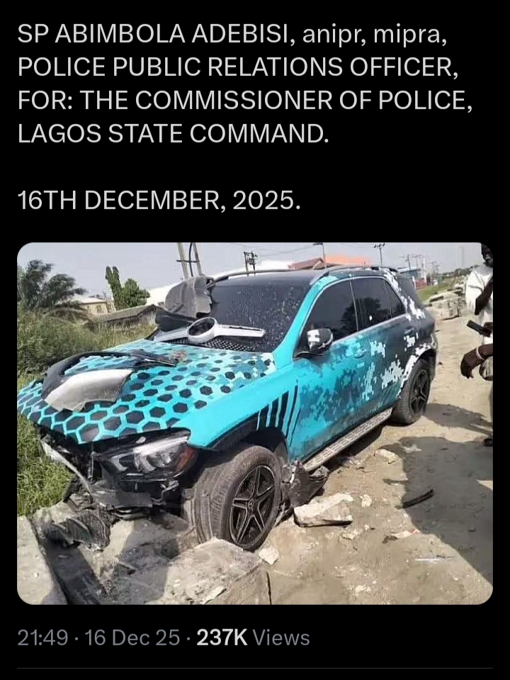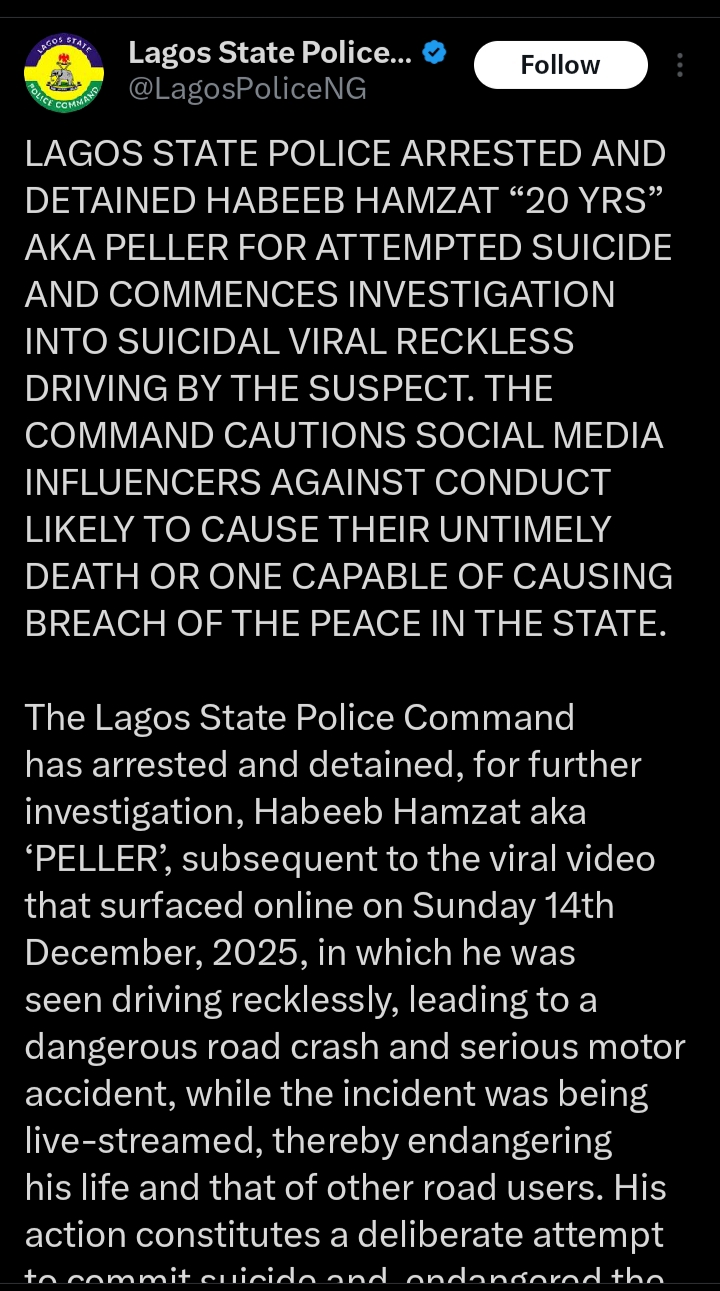 The Lagos State Police Command has arrested and detained, for further investigation, Habeeb Hamzat aka ‘PELLER’, subsequent to the viral video that surfaced online on Sunday 14th December, 2025, in which he was seen driving recklessly, leading to a dangerous road crash and serious motor accident, while the incident was being live-streamed, thereby endangering his life and that of other road users. His action constitutes a deliberate attempt to commit suicide and endangered the life of other innocent people.
