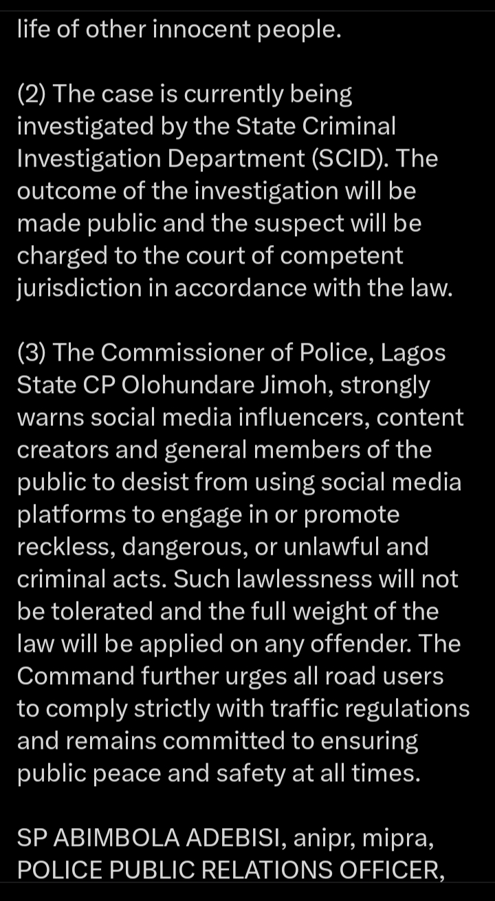 (3) The Commissioner of Police, Lagos State CP Olohundare Jimoh, strongly warns social media influencers, content creators and general members of the public to desist from using social media platforms to engage in or promote reckless, dangerous, or unlawful and criminal acts. Such lawlessness will not be tolerated and the full weight of the law will be applied on any offender. The Command further urges all road users to comply strictly with traffic regulations and remains committed to ensuring public peace and safety at all times.