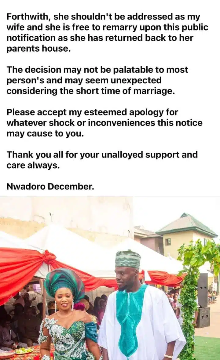 It was gathered that the couple got married in February 2023 and in June the husband took to Facebook to divorce his wife.