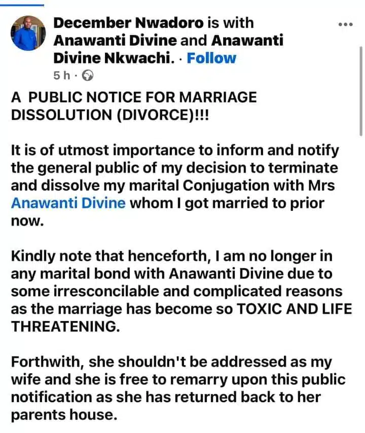 Kindly note that henceforth, I am no longer in any marital bond with Anawanti Divine due to some irresconcilable and complicated reasons as the marriage has become so TOXIC AND LIFE THREATENING.