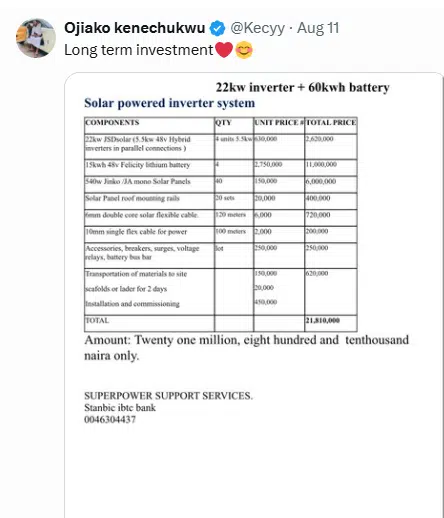 Nigerian man who lamented spending N200K on grid electricity in 4 days spends N21.8M to install solar in his house.