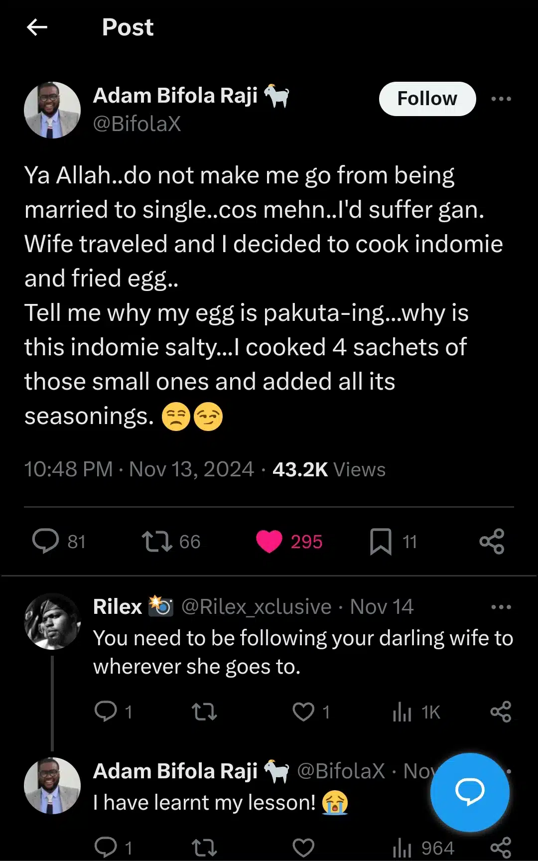 His statement: “Ya Allah… Do not make me go from being married to single… Because mehn… I’d suffer greatly. My wife traveled, and I decided to cook indomie and fried egg. Tell me why my egg is pakuta-ing? Why is this indomie so salty? I cooked four sachets of those small ones and added all the seasonings. 😒😏”