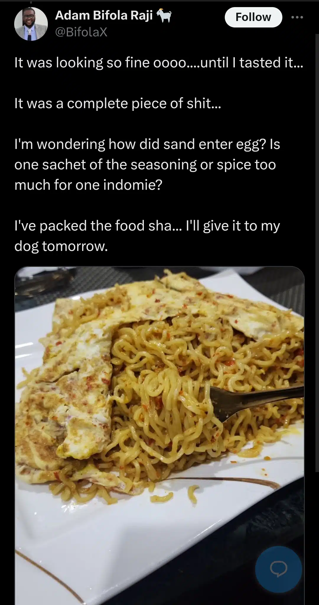 He continued, saying the noodles looked fine, but after tasting them, he was disappointed in himself for creating something so awful. “It was looking so fine ooo… until I tasted it… It was a complete disaster. I’m wondering, how did sand get into the egg? Is one sachet of seasoning too much for one indomie? I’ve packed it up though… I’ll give it to my dog tomorrow.”