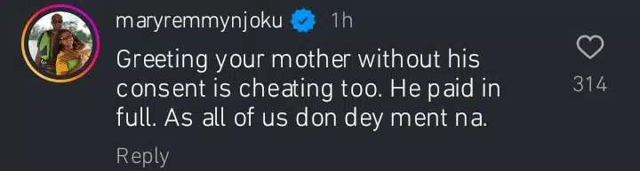 “Greeting your mother without his consent is cheating too. He paid in full. As all of us don dey ment na,” she wrote.