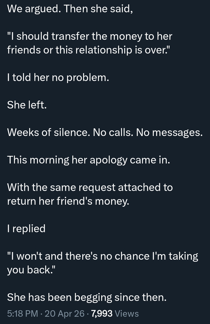Weeks after the breakup, the man revealed that his former girlfriend reached out with an apology. However, he claimed that her message still included a request for him to refund her friends.