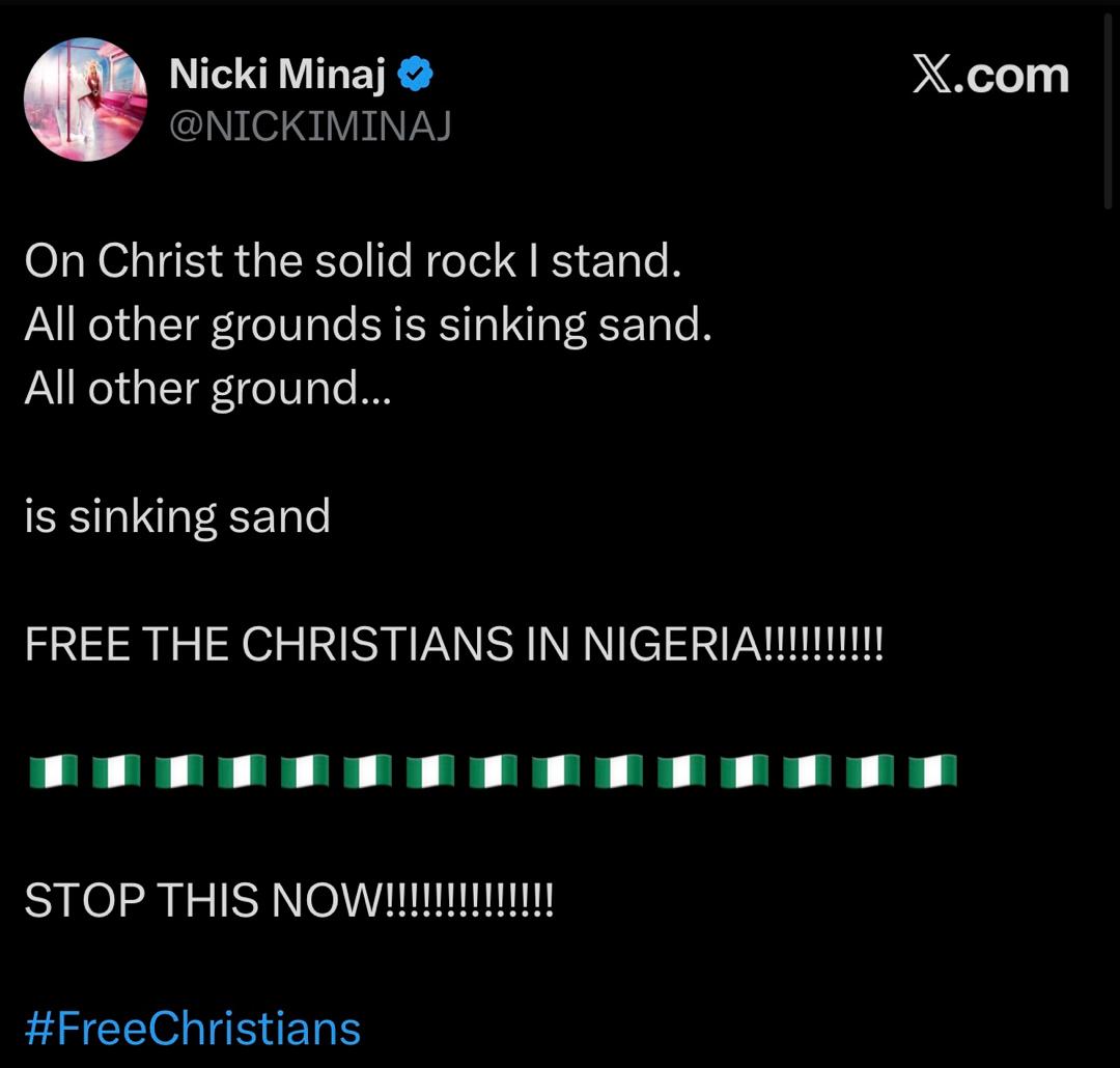American rapper, Nicki Minaj has once again spoken out about the killings in Nigeria, calling for the freedom of Christians and an end to the ongoing violence.