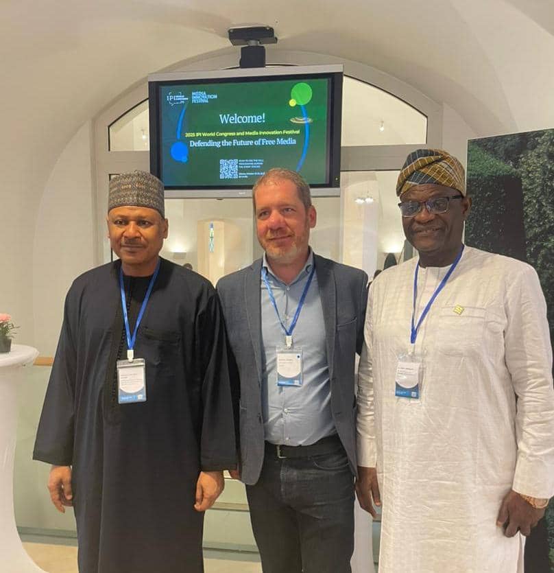Photo: L-R: Minister of Information and National Orientation, Mohammed Idris; International Press Institute (IPI), Executive Board Chairman, Mr. Marton Gergely and IPI Executive Board Member, Mr. Raheem Adedoyin at the World Congress and 75th Anniversary of the International Press Institute in Vienna, Austria at the weekend