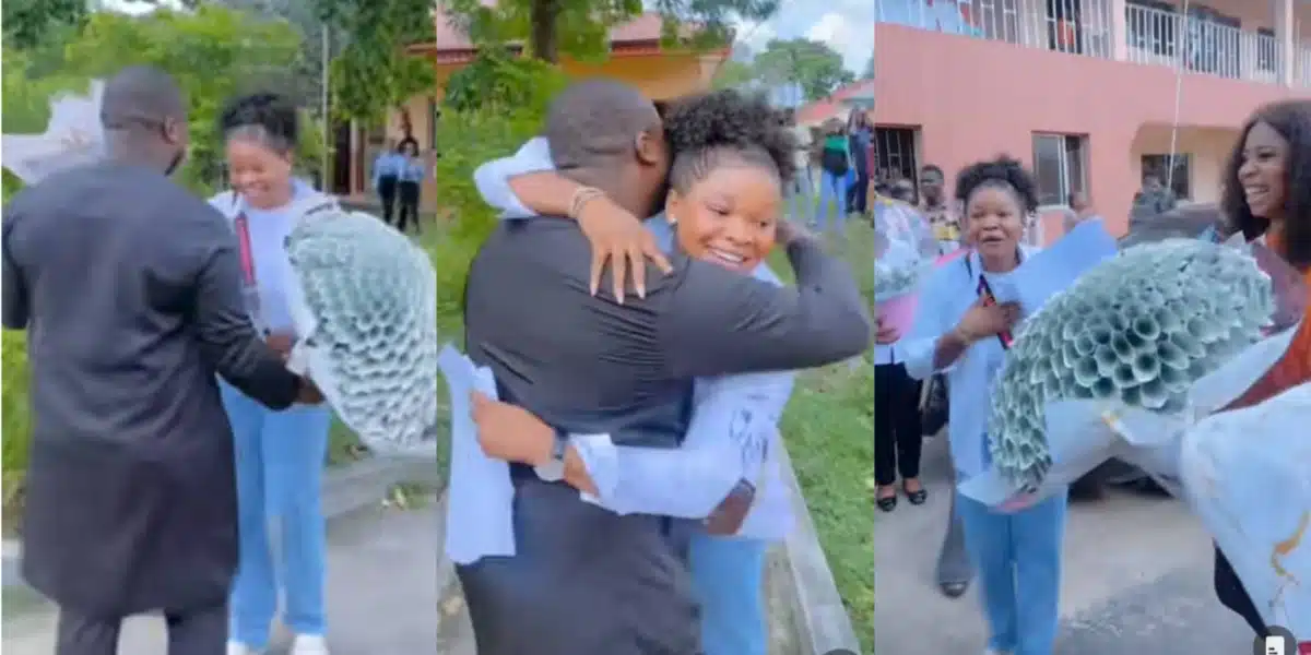 In a viral video, the lady was seen enthusiastically rushing towards her boyfriend upon his arrival with gifts. She tossed aside the money bouquet he brought, embracing and kissing him warmly.