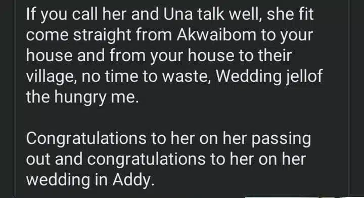 Lastly, he congratulated her on her passing out from the National Youth Program and on her wedding in advance.