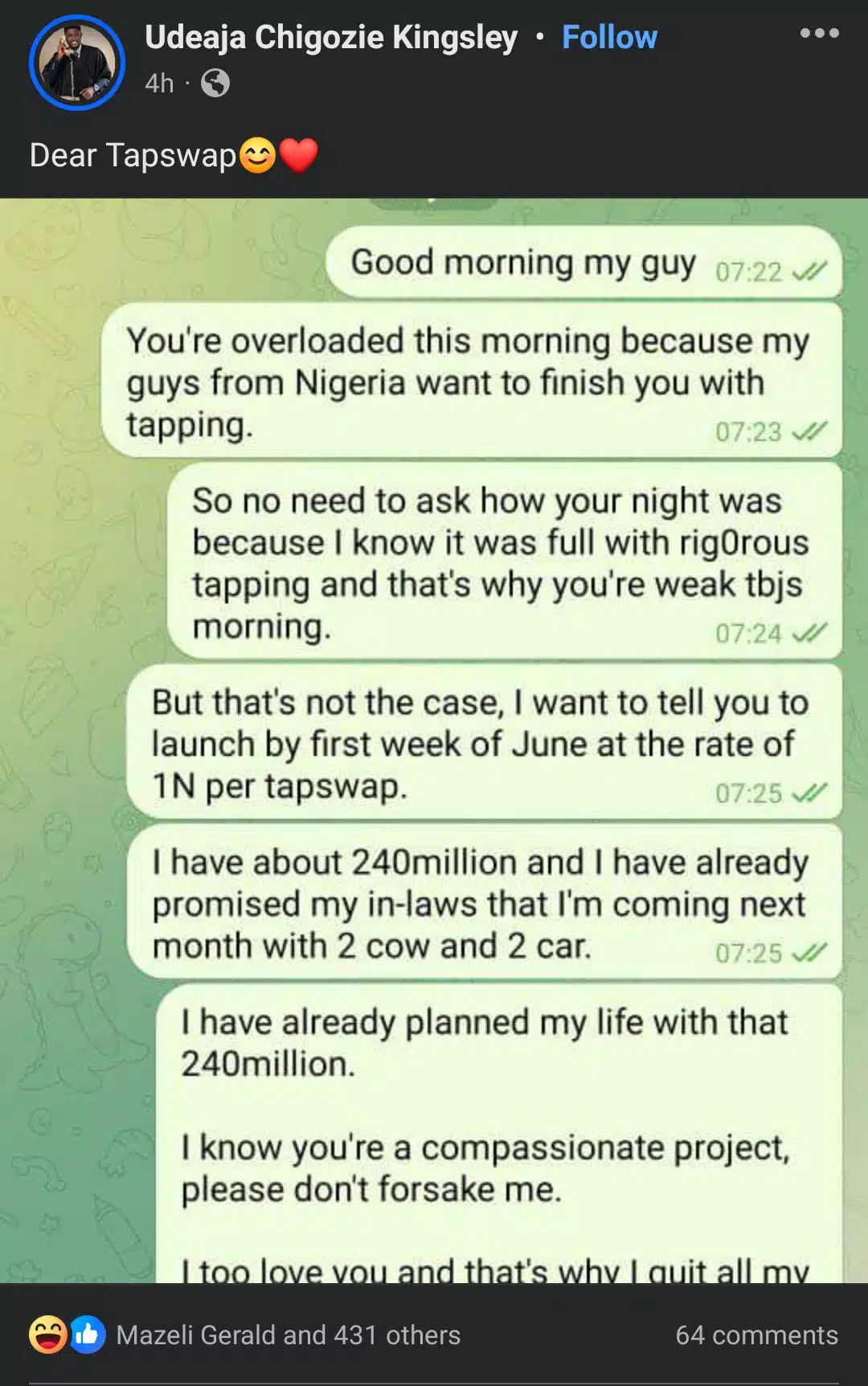 A Nigerian man has promised his in-laws two cars and two cows as he prepares to visit them next month, while begging TapSwap to launch their platform on June 1 so he can turn his 240 million TapSwap coins into 240 million naira.