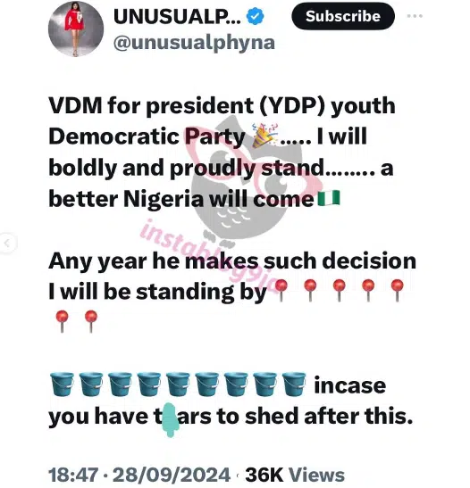 “VDM for president (YDP) youth Democratic Party .„,. I will boldly and proudly stand … better Nigeria will come Any year he makes such decision I will be standing by