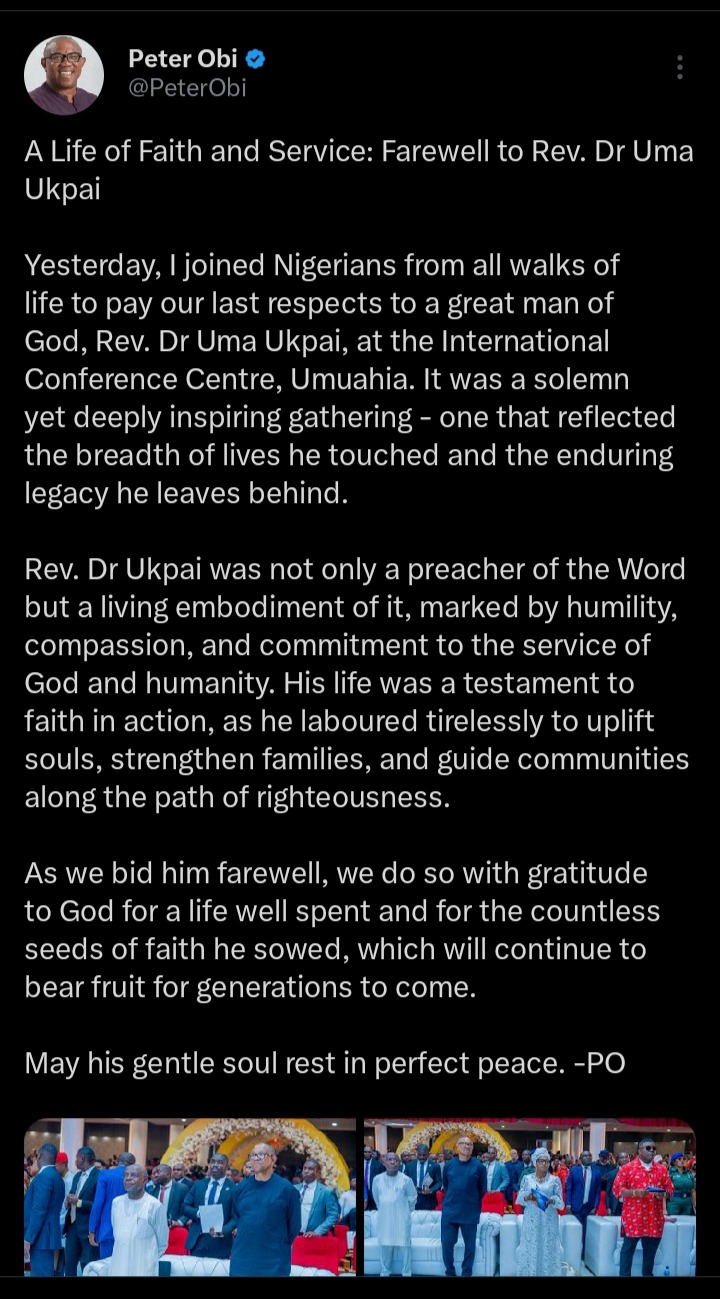 According to his statements, he pointed out that Reverend Dr Uma Ukpai touched many lives and left behind an enduring legacy. Uma Ukpai, According to Peter Obi, was a man of humility and an embodiment of humanity.