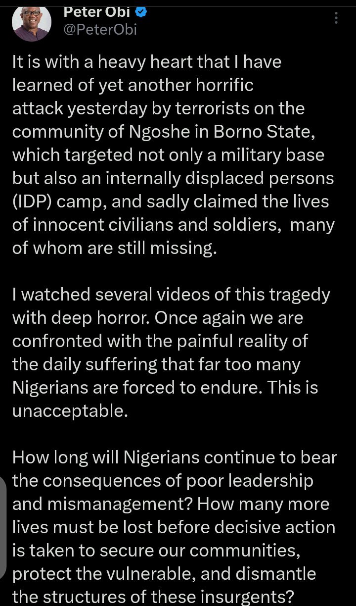 Many social media users have been reacting online after Peter Obi shared his thoughts on a disturbing video showing the aftermath of an attack in Borno State where several soldiers were reportedly killed by bandits.