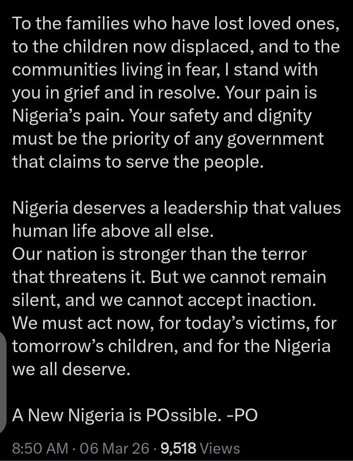 Obi also suggested that repeated security tragedies across the country reflect deeper issues with governance, arguing that poor leadership has contributed to the challenges Nigerians continue to face.