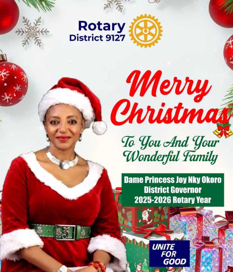 Dame (Dr) Princess Joy Nky Okoro, Governor, Rotary International District 9127, says Christmas embodies the values of love, hope, sacrifice, and renewal, saying those ideals resonate profoundly with the spirit of Rotary.