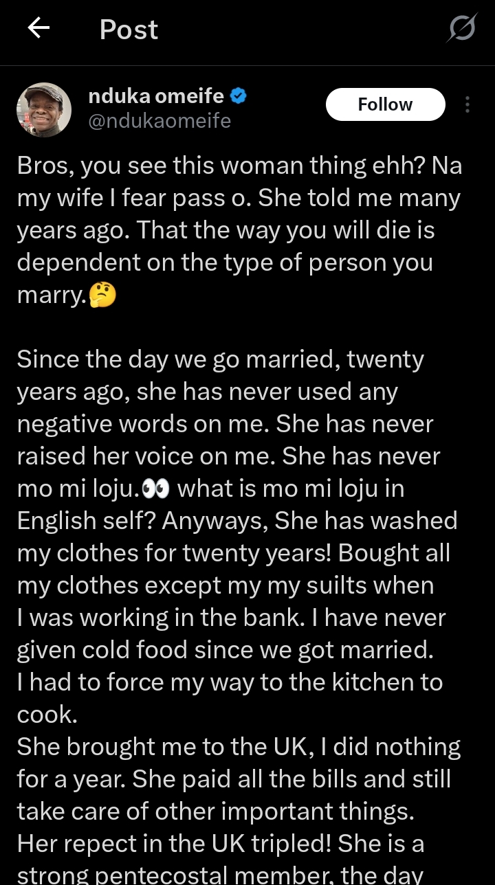 The man, identified as @ndukaomoeifeo on X (formerly Twitter), shared that he’s been married to his wife for over 20 years.