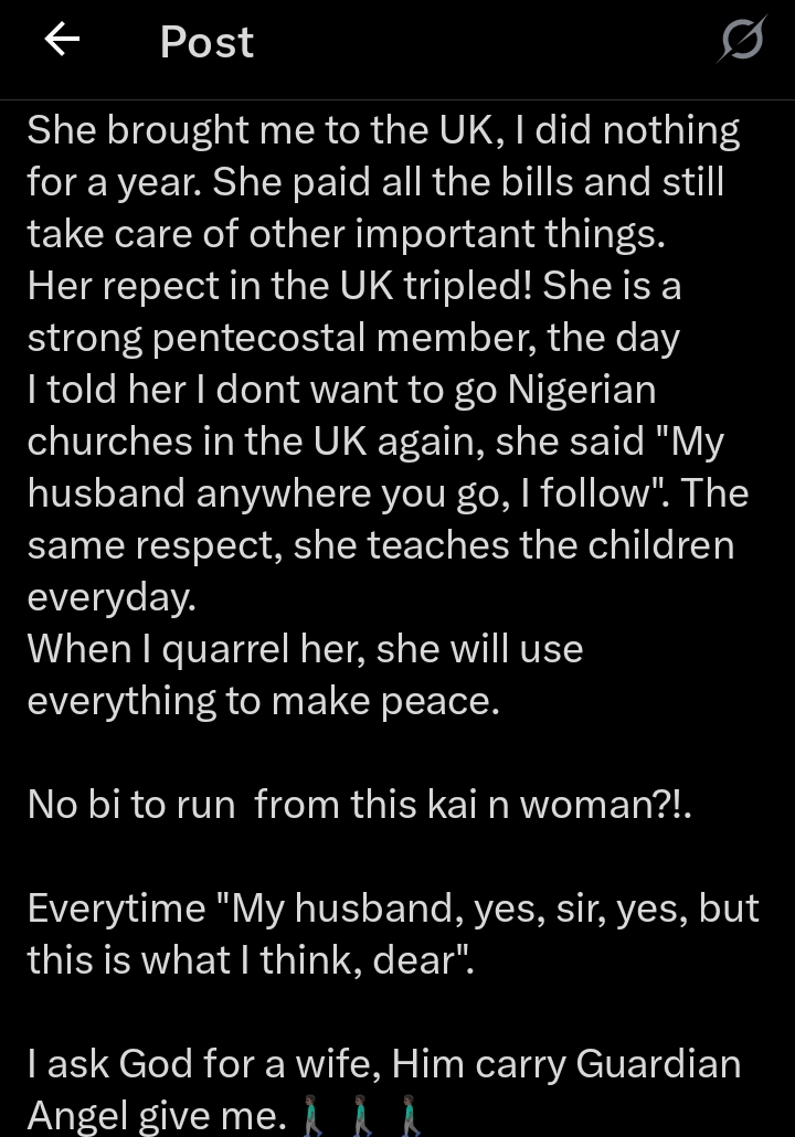 In his tweet, the X user further shared, “I told her I dont want to go Nigerian churches in the UK again, she said “My husband anywhere you go, I follow”. The same respect, she teaches the children everyday.When I quarrel her, she will use everything to make peace”.