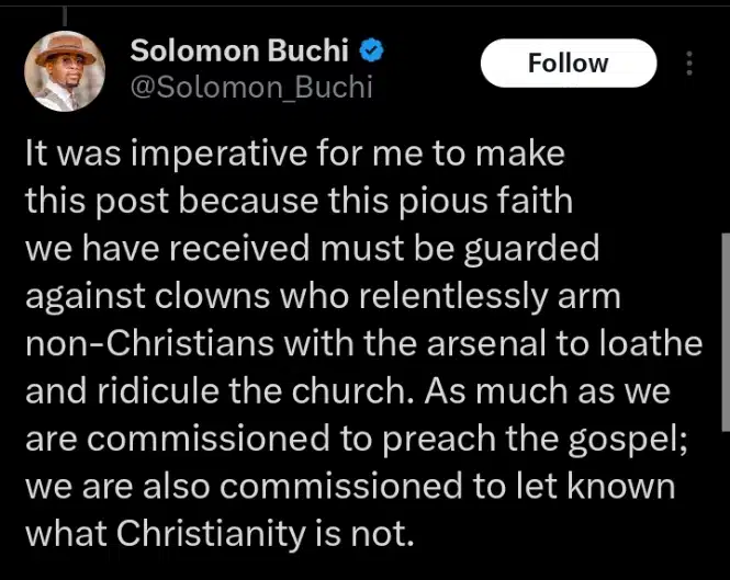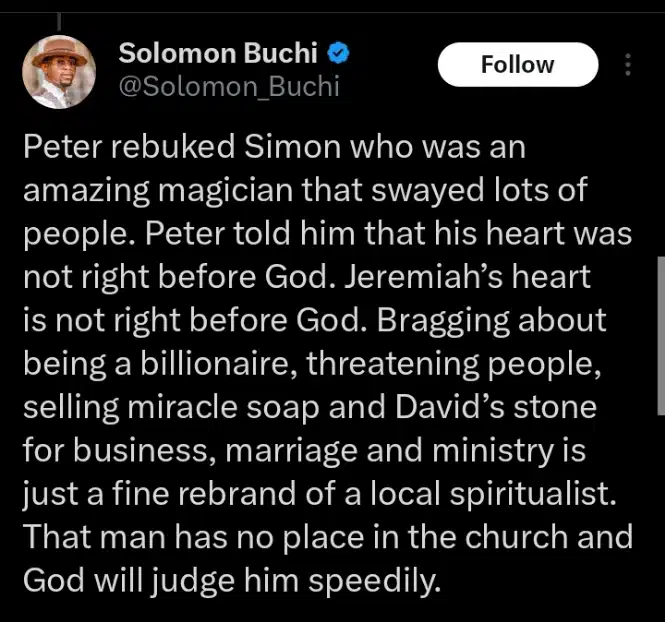 In a post on his X page, Solomon Buchi asserted that Prophet Jeremiah is not a Christian or a man of God.