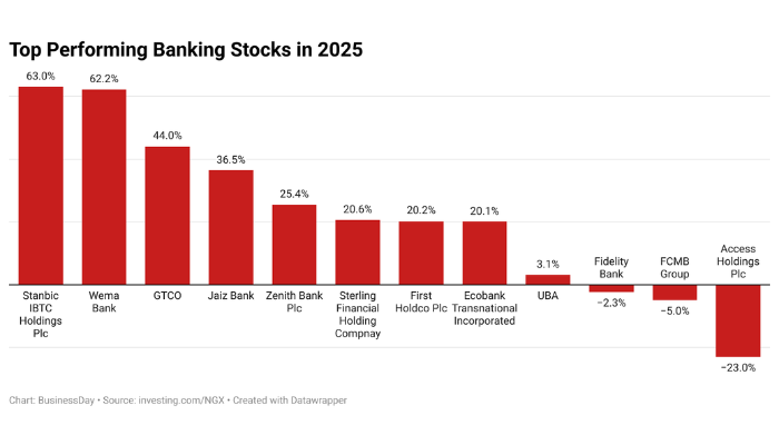 Nigeria’s banking stocks delivered divergent performances on the Nigerian Exchange (NGX) in 2025, with Stanbic IBTC Holdings and Wema Bank topping the list.