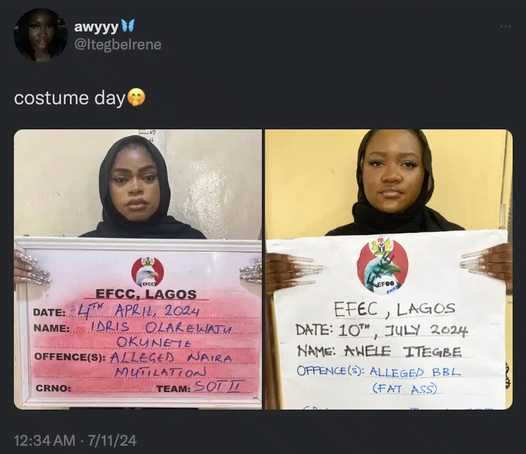 In a recent development, Irene who seemed to be a fan of Bobriksy recreated his EFCC mugshot as her preferred costume day outfit.