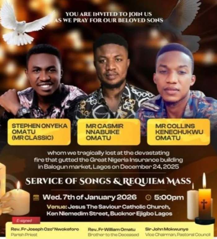 The three Omatu brothers who lost their lives in the inferno that gutted the 25-storey Great Nigeria Insurance House on Lagos Island will be laid to rest on January 14.