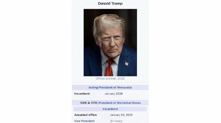 The image, shared on Sunday, resembled a mock Wikipedia entry and declared Trump as Venezuela’s acting leader as of January 2026.