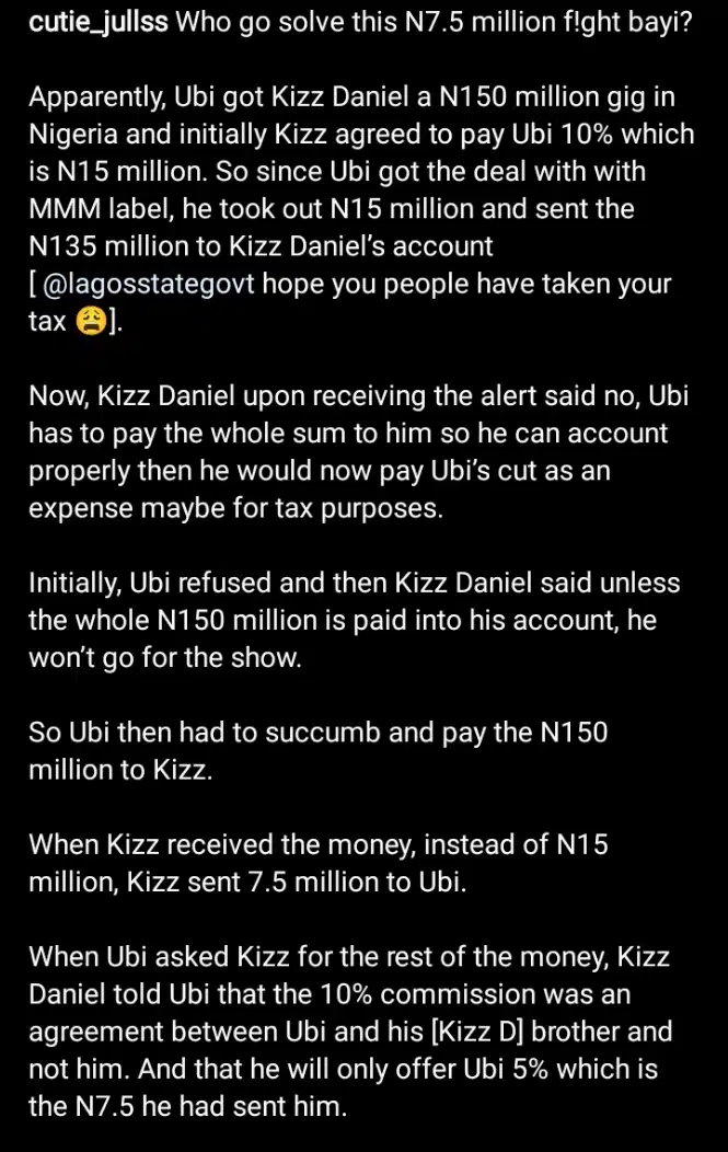 Cutie Juls wrote: “Apparently, Ubi got Kizz Daniel a N150 million gig in Nigeria and initially Kizz agreed to pay Ubi 10% which is N15 million. So since Ubi got the deal with with MMM label, he took out N15 million and sent the N135 million to Kizz Daniel’s account [ @lagosstategovt hope you people have taken your tax 😩].