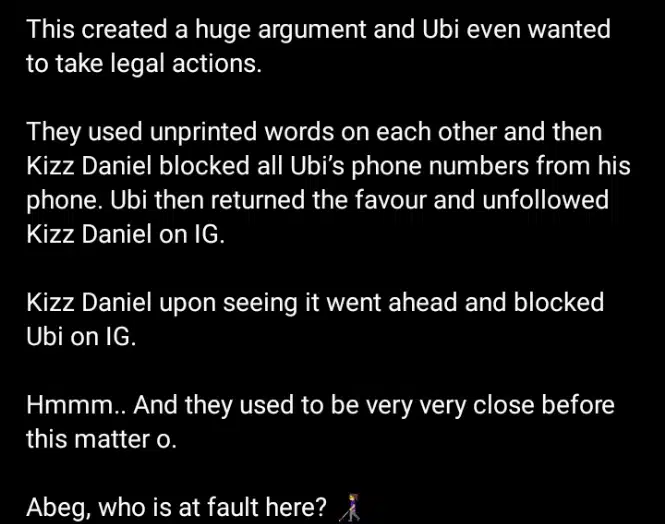 “Kizz Daniel upon seeing it went ahead and blocked Ubi on IG.”