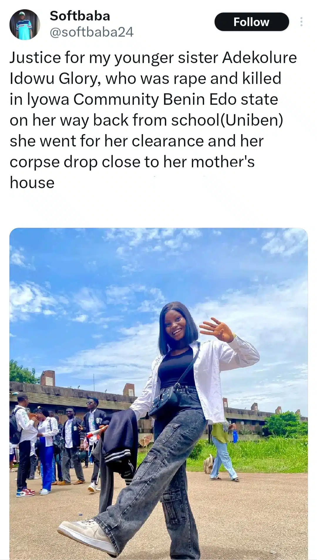 Her brother took to X to write: “Justice for my younger sister Adekolure Idowu Glory, who was raped and killed in Lyowa Community Benin Edo state on her way back from school (Uniben) she went for her clearance and her corpse drop close to her mother’s house.