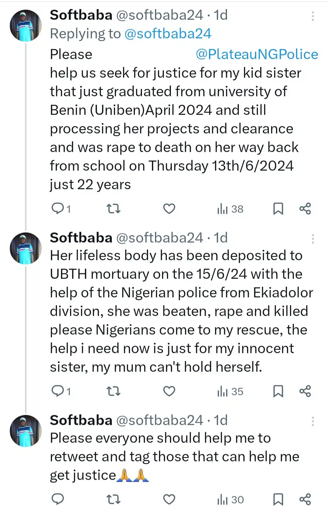 “Please help us seek justice for my kid sister that just graduated from the University of Benin (Uniben) in April 2024 and still processing her projects and clearance and was raped to death on her way back from school on Thursday 13th/6/2024 just 22 years.