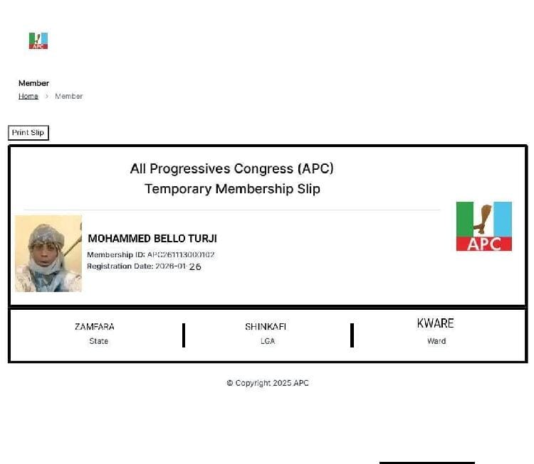 The Zamfara chapter of the All Progressives Congress (APC) has denied any link between the party and bandit leader Bello Turji, saying the membership card bearing his name and image is fake.