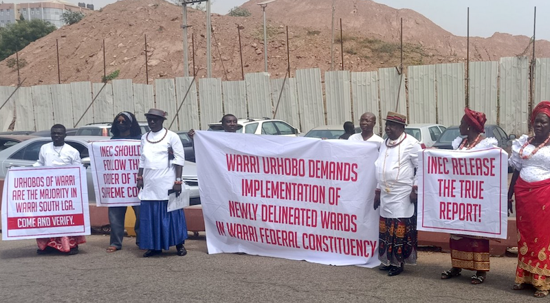 Leader of the Warri Urhobo delegation, Chief Adehor Westham, speaking on behalf of the protesters said they were at INEC to demand the release of the delineation report.