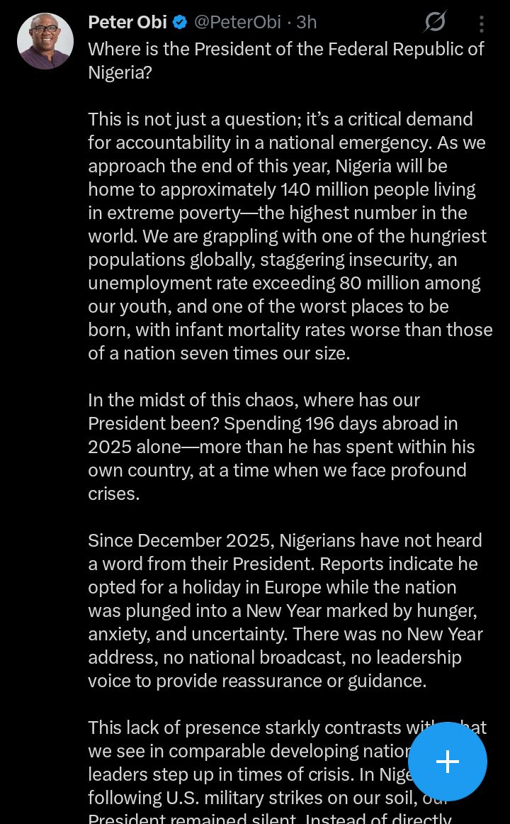 Obi criticised the President for spending significant periods abroad in 2025 while millions of Nigerians grapple with extreme poverty, insecurity, and unemployment.