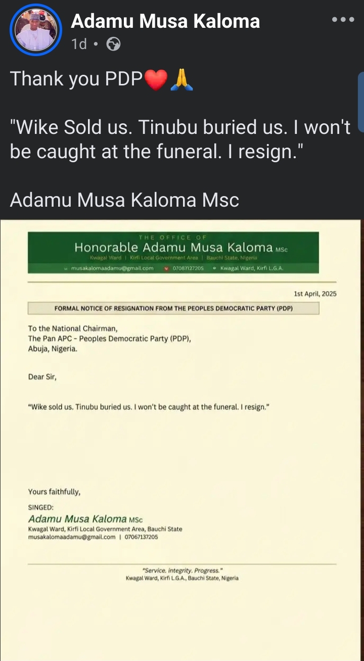 Hon. Adamu Musa Kaloma drew attention on social media with a brief but striking message announcing his departure. The letter, which quickly went viral, was addressed in an unusual manner to “The pan APC – Peoples Democratic Party, Abuja.”