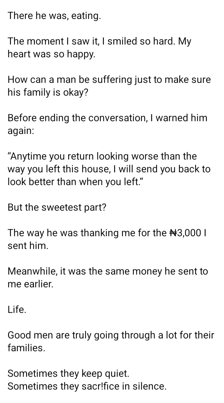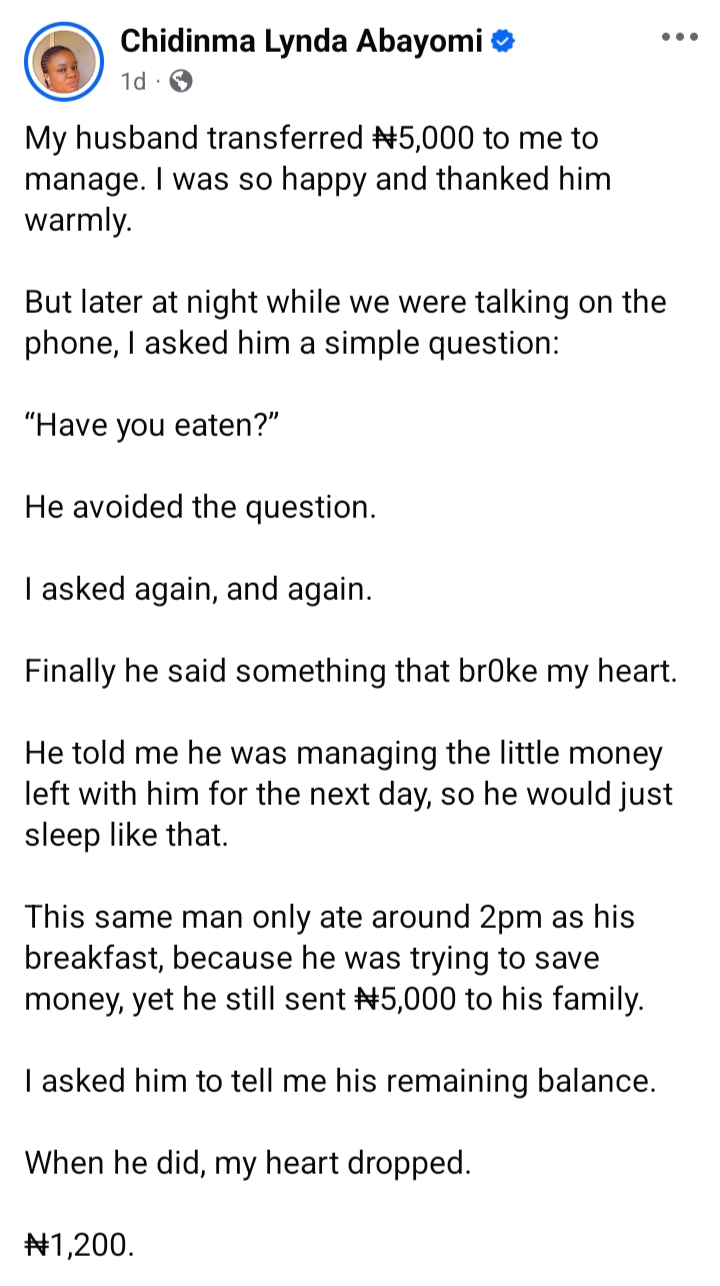 She recounted how her husband had transferred ₦5,000 to her to manage, and she was grateful. Later that night, during a phone conversation, she asked him if he had eaten.