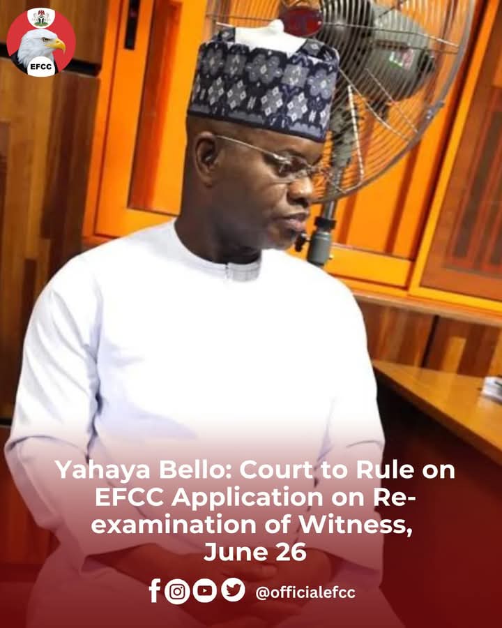 Justice Emeka Nwite of the Federal High Court, Abuja, on Friday, May 9, 2025, adjourned proceedings in the trial of the former Kogi State governor, Yahaya Adoza Bello till June 26 and 27, and July 3 and 4, 2025 for ruling on the relief sought by the EFCC’s counsel, to re-examine its third witness, Nicholas Ojehomon on the matter of the school fees of the defendant’s children in American International School, Abuja, AISA.