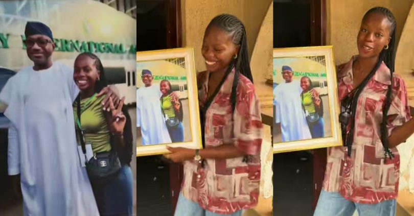 The viral video captures the lady’s excitement as she takes a photo with Femi Otedola, which she eventually framed.
