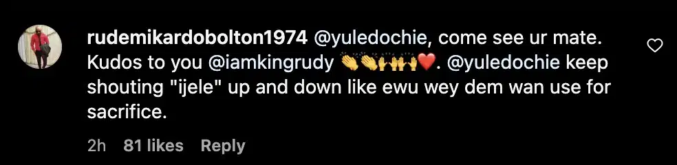rudemikardobolton1974 stated: “@yuledochie, come see ur mate. Kudos to you @iamkingrudy 👏👏🙌🙌❤️. @yuledochie keep shouting “ijele” up and down like ewu wey dem wan use for sacrifice.”