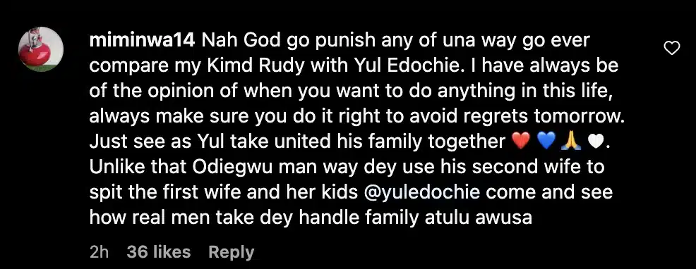 miminwa14 reacted: “Nah God go punish any of una way go ever compare my Kimd Rudy with Yul Edochie. I have always be of the opinion of when you want to do anything in this life, always make sure you do it right to avoid regrets tomorrow. Just see as Yul take united his family together ❤️ 💙 🙏 ♥️. Unlike that Odiegwu man way dey use his second wife to spit the first wife and her kids @yuledochie come and see how real men take dey handle family atulu awusa.”