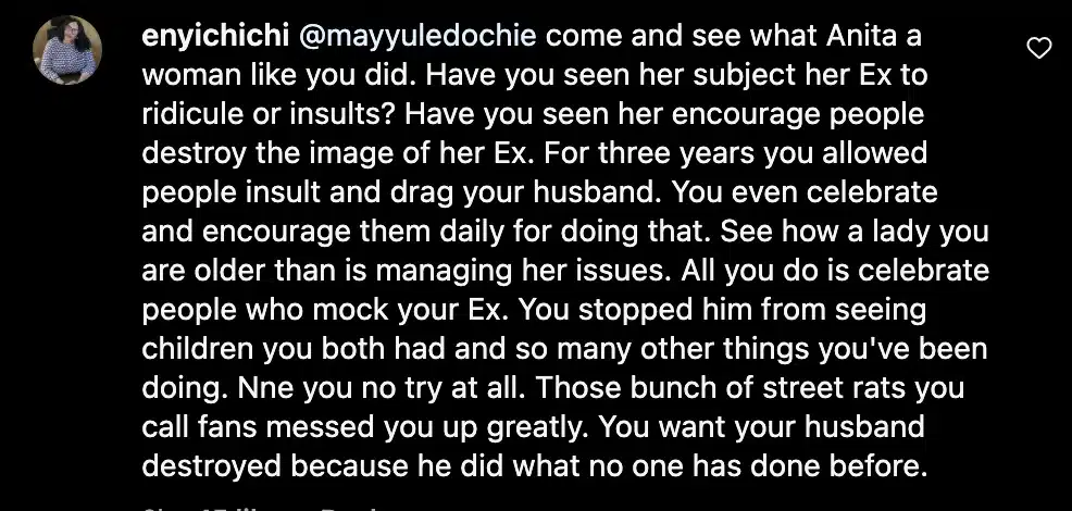enyichichi reacted: “@mayyuledochie come and see what Anita a woman like you did. Have you seen her subject her Ex to ridicule or insults? Have you seen her encourage people destroy the image of her Ex. For three years you allowed people insult and drag your husband. You even celebrate and encourage them daily for doing that. See how a lady you are older than is managing her issues. All you do is celebrate people who mock your Ex. You stopped him from seeing children you both had and so many other things you’ve been doing. Nne you no try at all. Those bunch of street rats you call fans messed you up greatly. You want your husband destroyed because he did what no one has done before.”